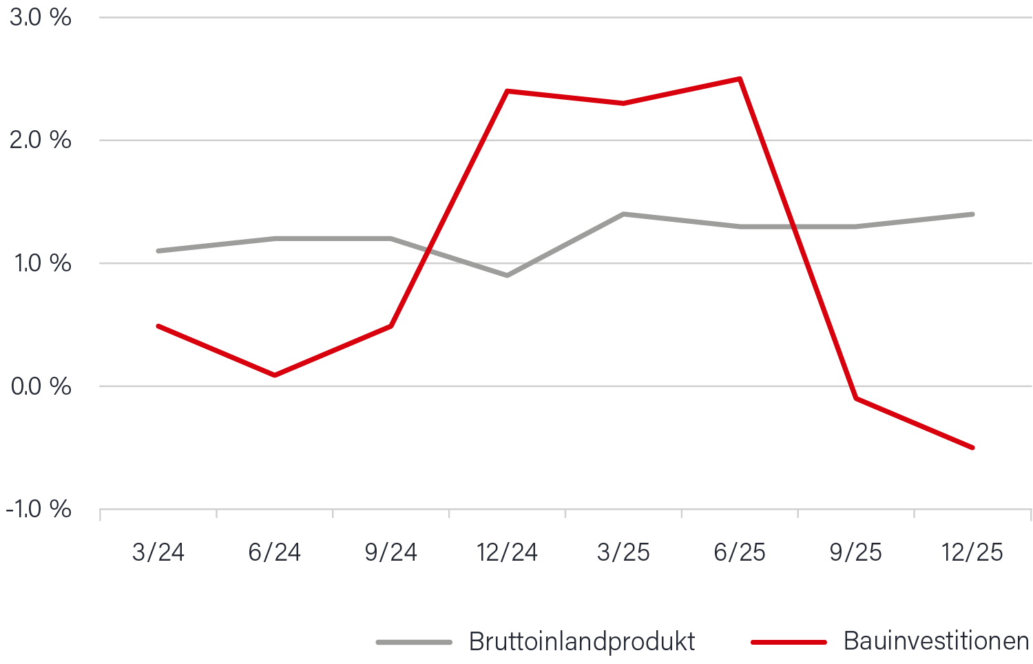 Die Wachstumserwartungen für das Bruttoinlandprodukt (BIP) bewegen sich seit dem ersten Quartal 2024 in einem leichten Aufwärtstrend. Allerdings ist die jüngere Entwicklung mit grösseren Unsicherheiten aufgrund des Zollstreits mit den USA sowie deren allenfalls noch nicht in die Statistik eingegangenen Auswirkungen behaftet. Die Wachstumsprognosen der Bauinvestitionen gleichen einer Berg- und Talfahrt – lagen diese von Mitte 2024 bis Mitte 2025 deutlich über dem BIP, haben sich die Erwartungen gegen Jahresende sogar ins Minus gedreht. Im letzten Quartal 2025 prognostizierte die Expertengruppe Konjunkturprognosen des Bundes für die Bauinvestitionen einen Rückgang von -0,5%. Damit sind auch die weiteren Aussichten für die Branche verhalten.