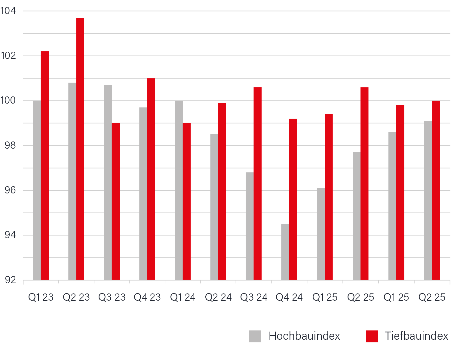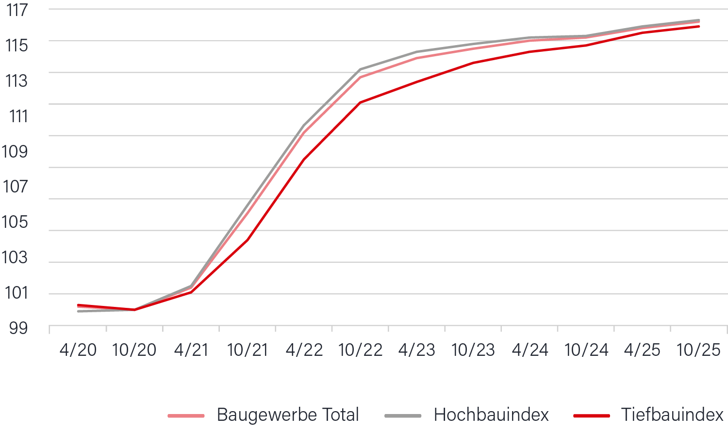 Der Baupreisindex des Bundesamtes für Statistik (BFS) erhöhte sich zwischen April und Oktober 2025 um 0,4% auf 116,2 Punkte. Innert Jahresfrist ist das Preisniveau im Baugewerbe um 1% gestiegen. Der Anstieg des Preisindexes im Hochbau ist gemäss BFS auf höhere Preise im «Ausbau 1» (Metallbauarbeiten), beim «Ausbau 2» (Bodenbeläge) sowie bei den «Sanitäranlagen» (Kücheneinrichtungen) zurückzuführen. Im Tiefbau wurden bei den «Trassenbauten» (Oberbau, Erd- und Unterbau) und bei den «Honoraren» höhere Preise beobachtet. Im Mehrjahresvergleich haben sich die Preise im Baugewerbe stabilisiert und entwickeln sich seitwärts bzw. leicht steigend.